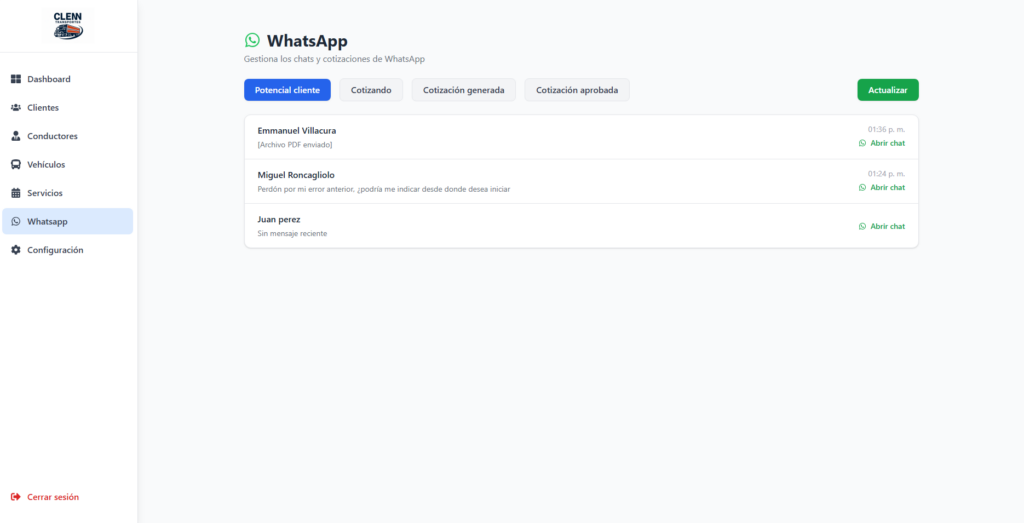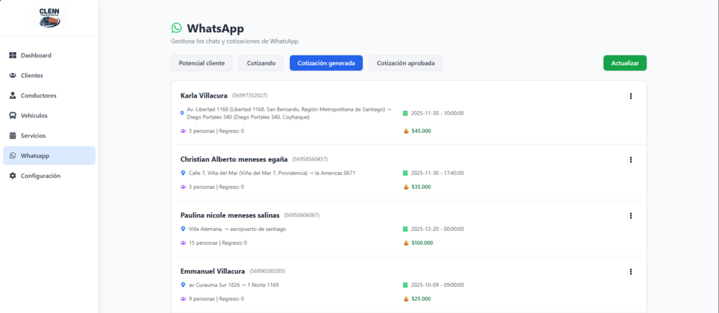 TransportesCLEMN integra inteligencia artificial y WhatsApp Business para agilizar el proceso de cotización, recopilando información clave, clasificando conversaciones y notificando al equipo de manera eficiente y segura.