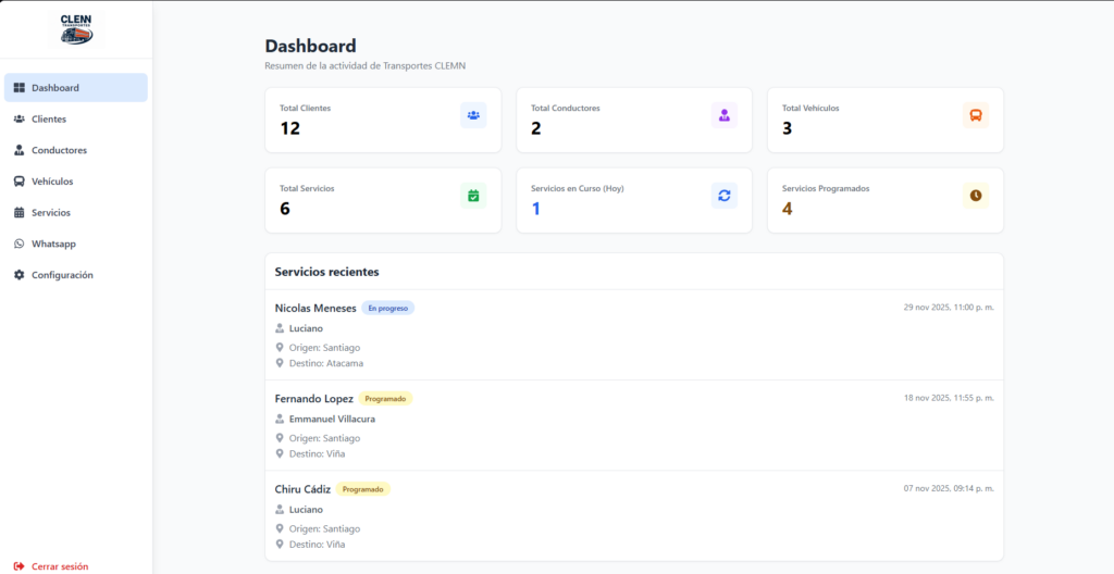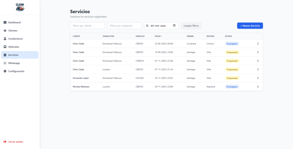Administra clientes, servicios, vehículos y conductores desde un sistema unificado que reemplaza procesos manuales y mejora la eficiencia operativa.